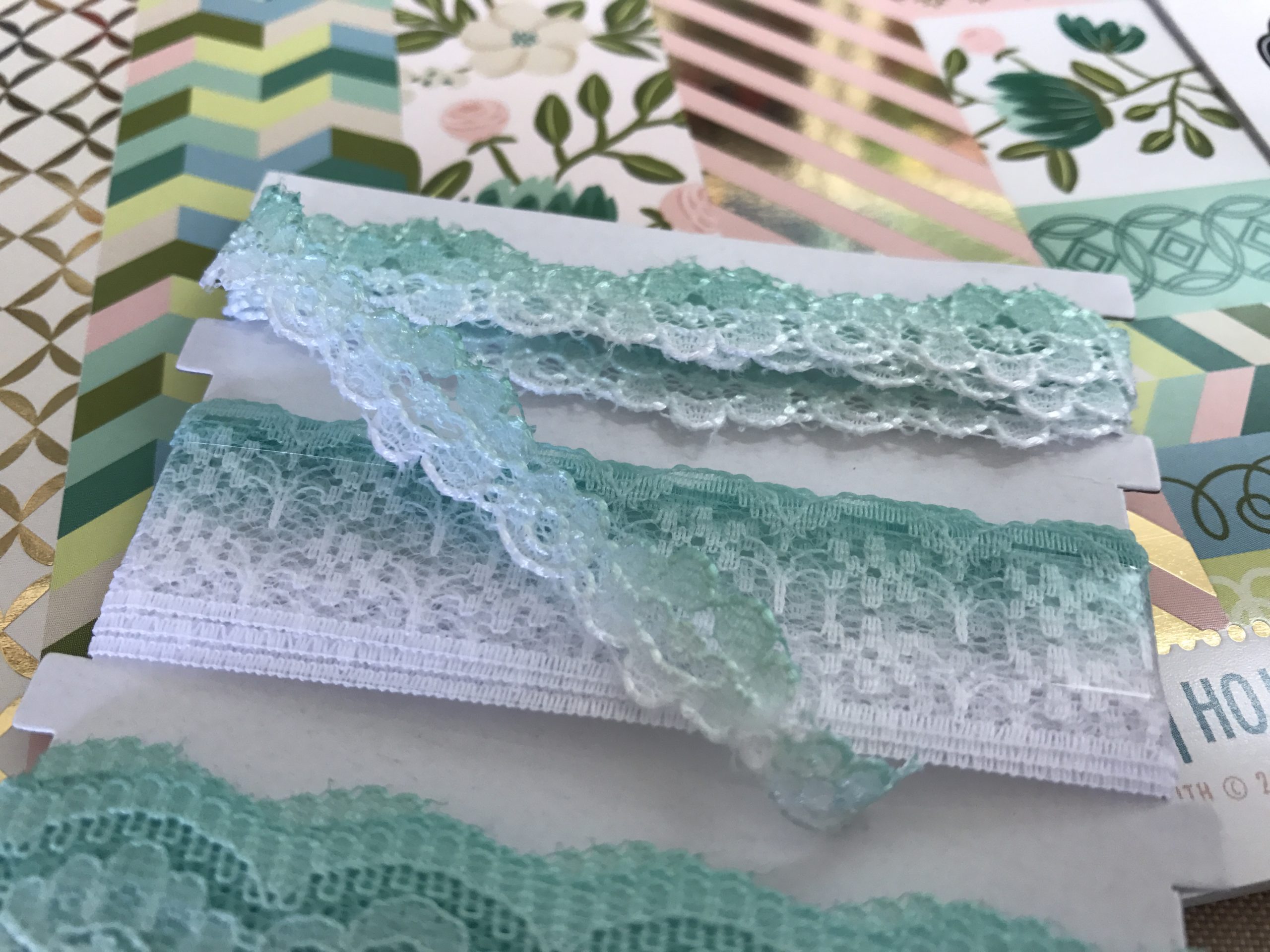 For the background of the card I used a gold and cream patterned paper from the Craft Smith Honeydew 6×6 paper pad and a green patterened paper from Pebbles Jen Hadfield Cottage Living 6×6 paper pad. To add some texture to the background, I added some green & white lace.