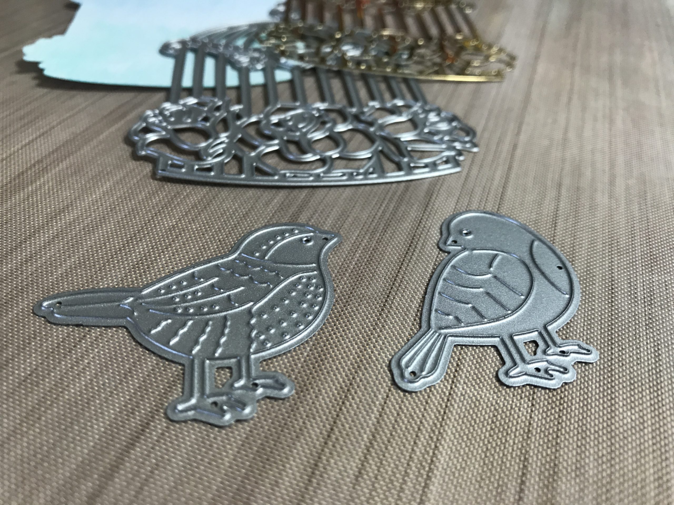 I used the gold die cut and my Brother Scan-n-Cut to cut out a background for the bird cage from some watercolor paper. I also cut out two birds from Watercolor paper using a bird die set.