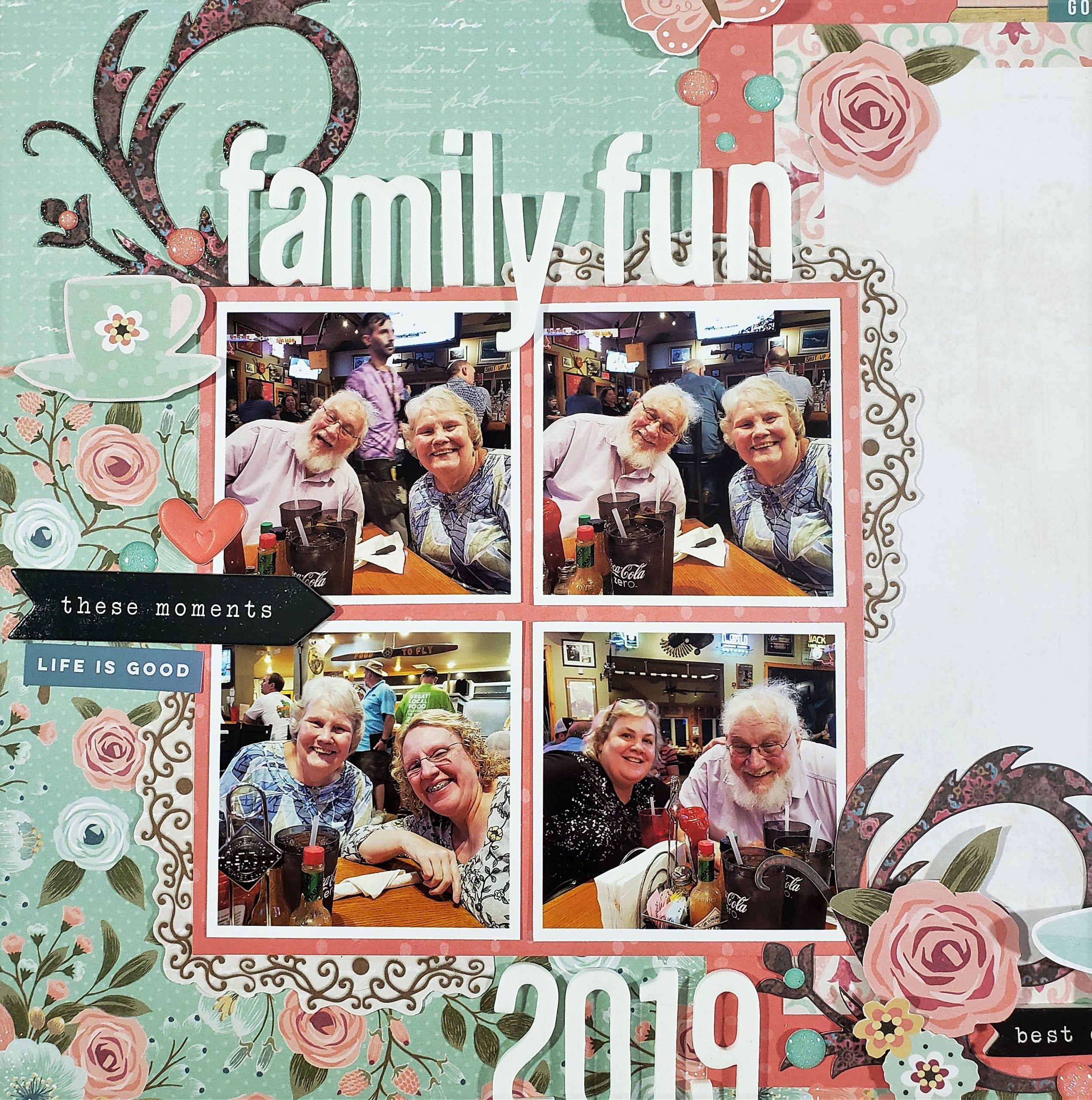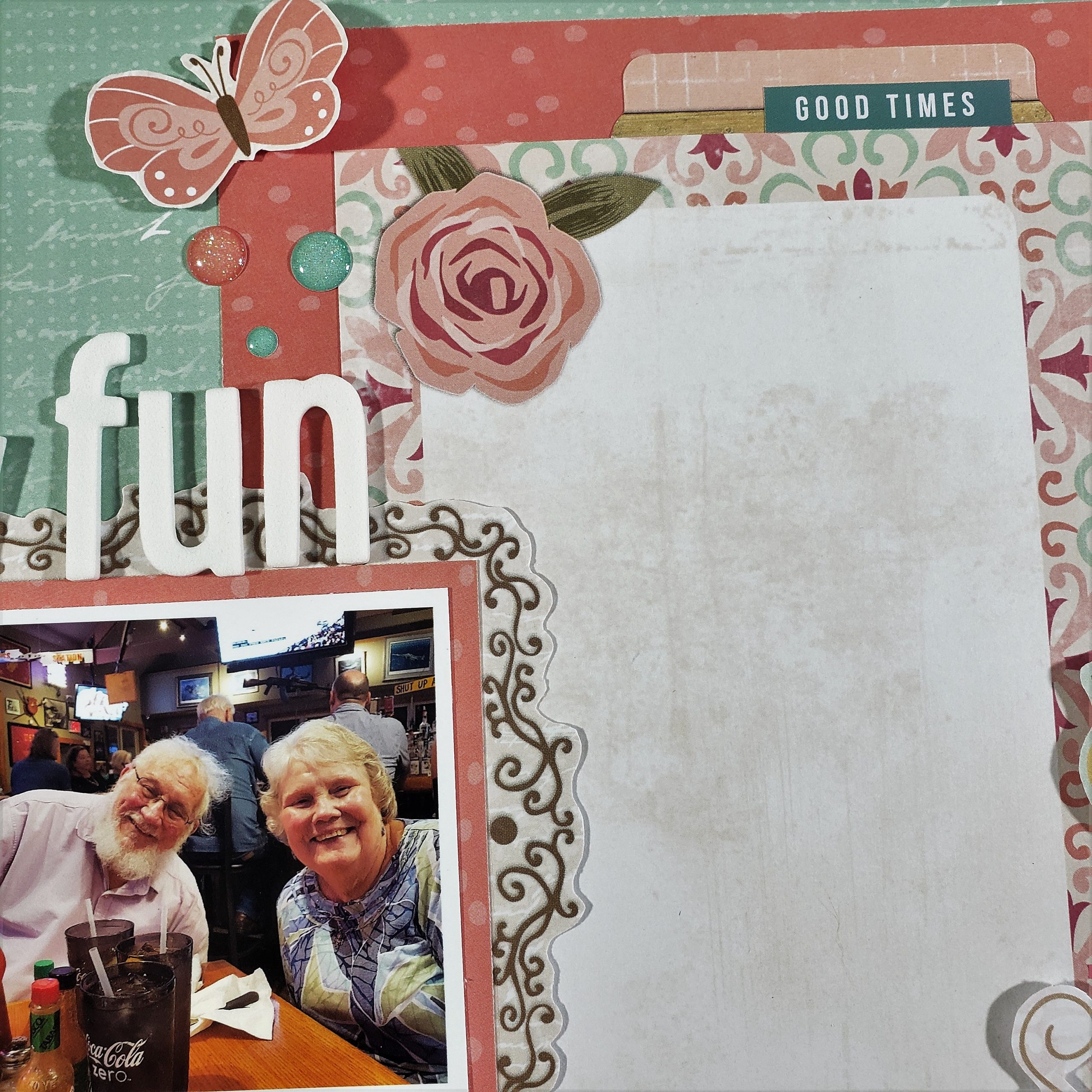 The pictures in this layout were taken at dinner out with my Uncle Richard. My Uncle had taken the MegaBus from Atlanta, GA down to New Orleans, so my Mom, my sister Terri and I drove over to New Orleans to pick him up from the bus station. On our way home, we stopped for dinner at the Southside Café in Slidell. The food was awesome and it was so good to visit with my Uncle. I wanted to save space on this layout for journaling, so I added a die-cut journaling spot from the Bo Bunny paper pad.