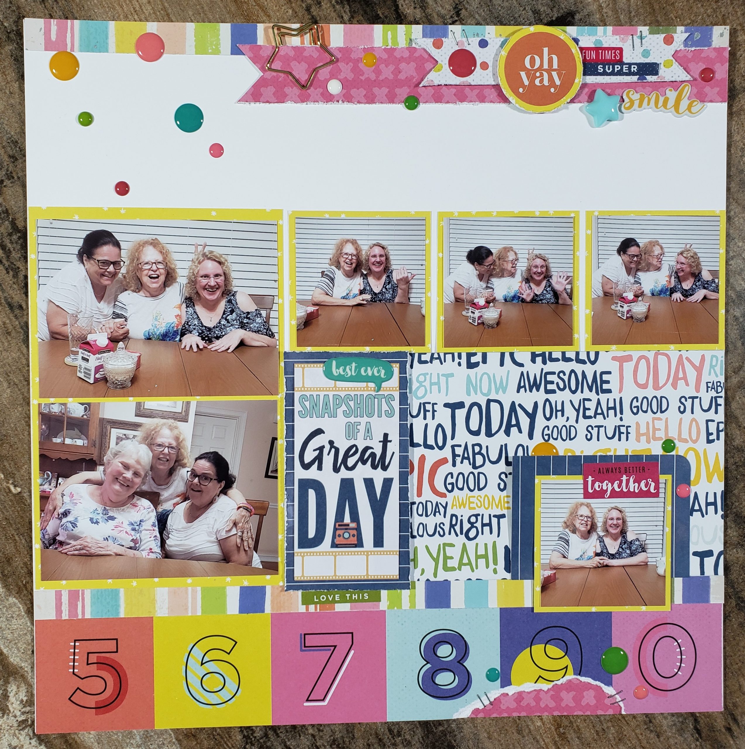 I choose to do both sides just because I liked the sketch and thought it would be the perfect layout for some pictures that we took with our Saturday Night Cards group. We’ve been meeting to play cards once a month on Saturday nights for a long time but have never taken any pictures. So, I suggested we get goofy and take a few snapshots. We had a lot of fun taking the pictures and it makes me happy to have these photos to remember the time we spent together. We have had such awesome, fun times together and it’s so wonderful to have created these layouts to capture the memories.