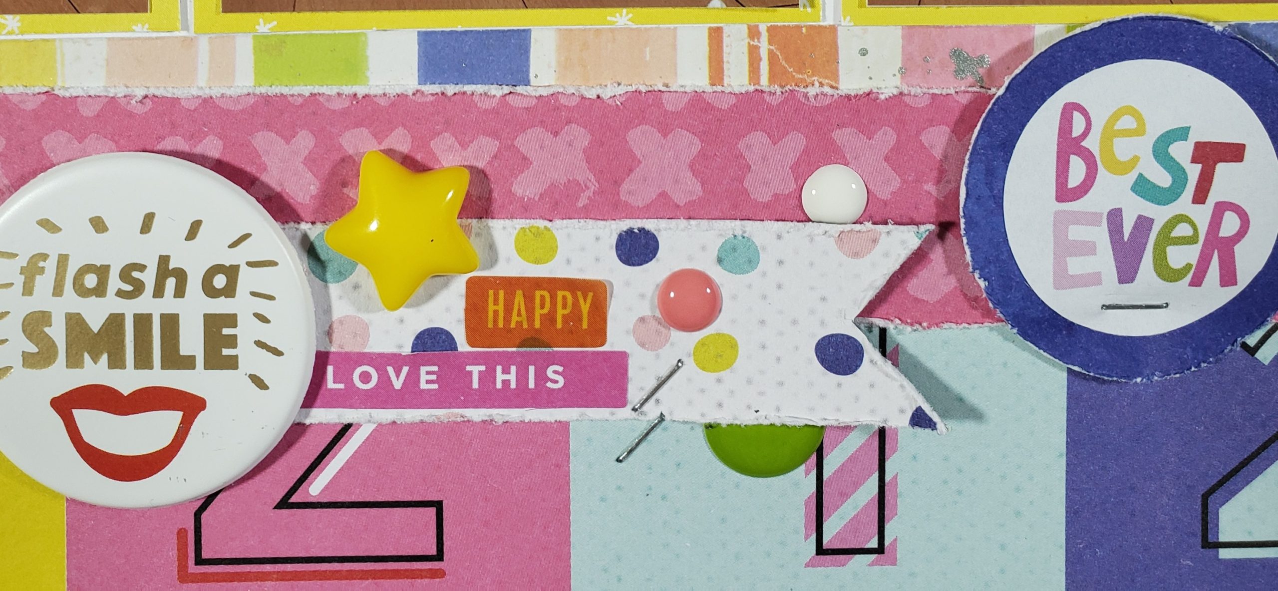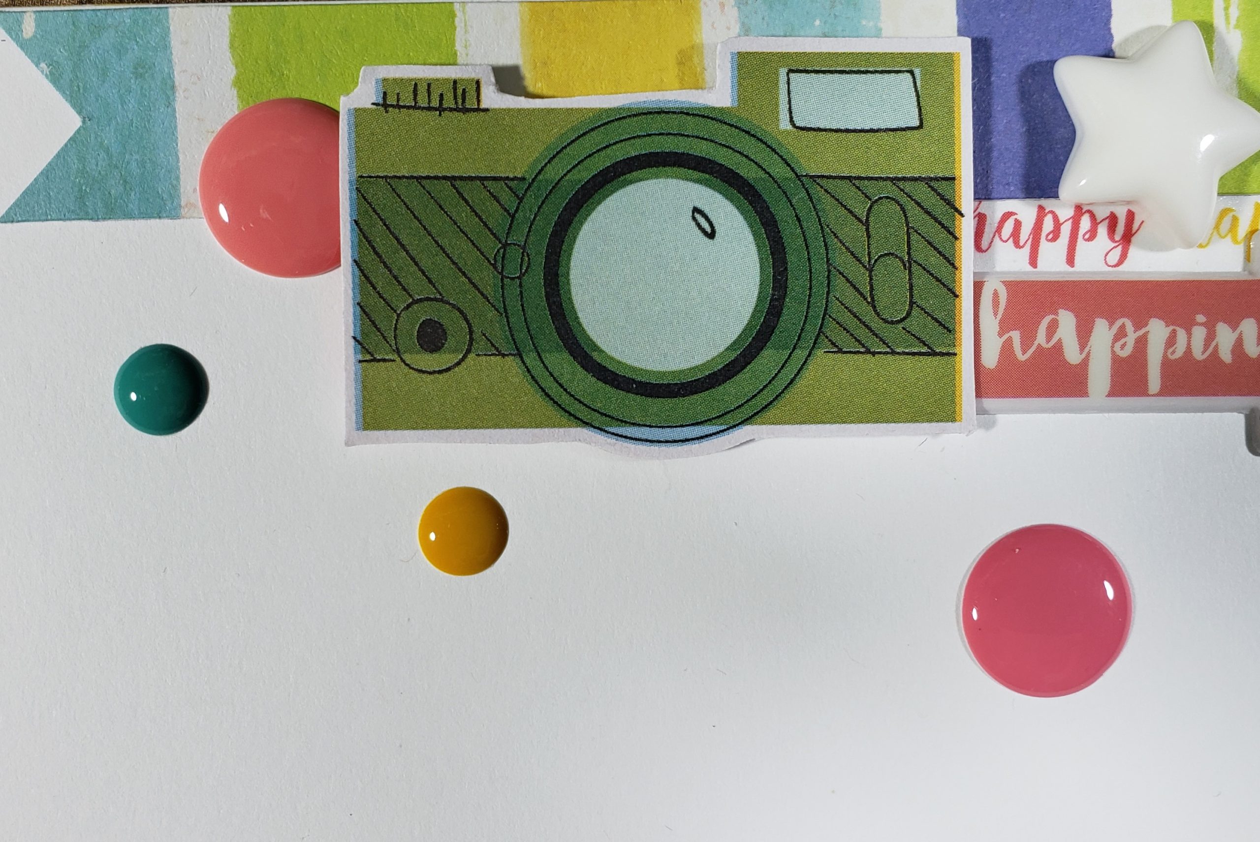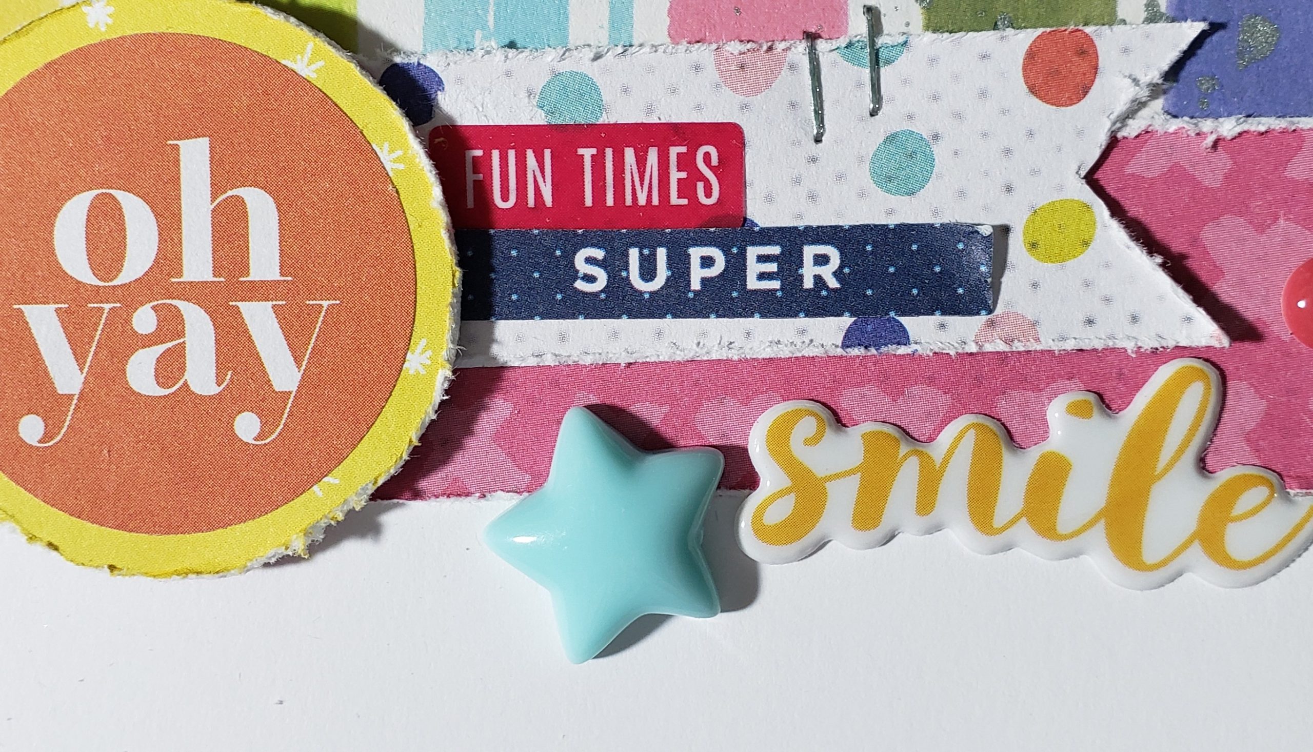 I used a 3×5 Project Life card with a fun saying on the right to balance out the title on the left. I thought the saying on the Project Life card “Snapshots of a Great Day” was so perfect for this layout. I then spent a lot of time going through my stash trying to find things to add to this layout. I ended up using a bunch of word stickers, some puffy stickers, a few resin stars, a resin paper clip and a lot of colorful enamel dots to embellish this layout. Here are some close ups.