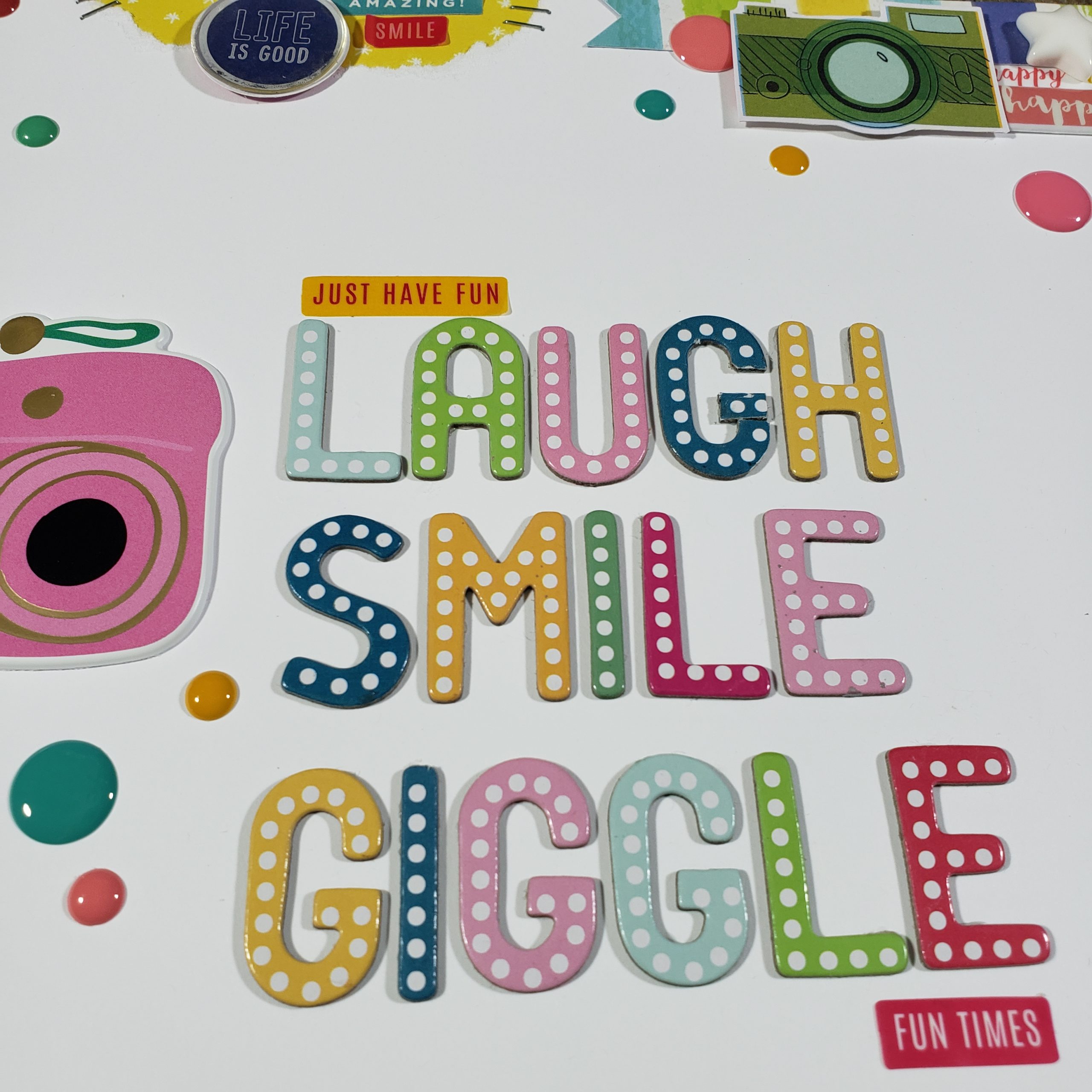 I used paper from the “Just My Type” paperpad and some scraps from another layout where I had used some paper from the Vicki Boutin Mixed Media paper pad. My title “Laugh, Smile, Giggle” came from the American Crafts Celebrate Thickers which turned out to be such a awesome addition to the layout.