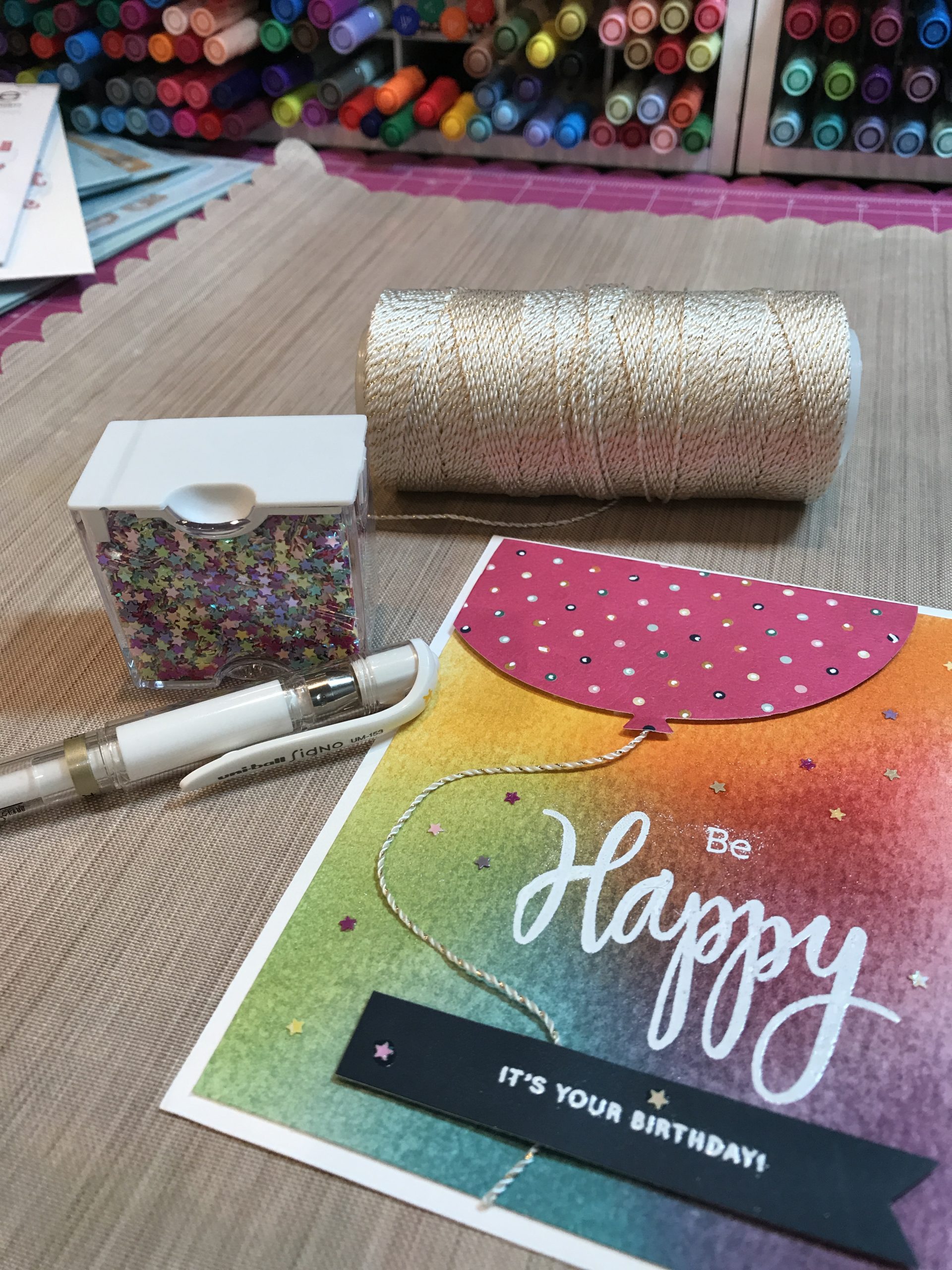 To add dimension, I took the white gel pen and added white dots on top of the dots on the balloon. To finish off the card and add some sparkle, I added a sprinkling of super tiny star confetti across the background.