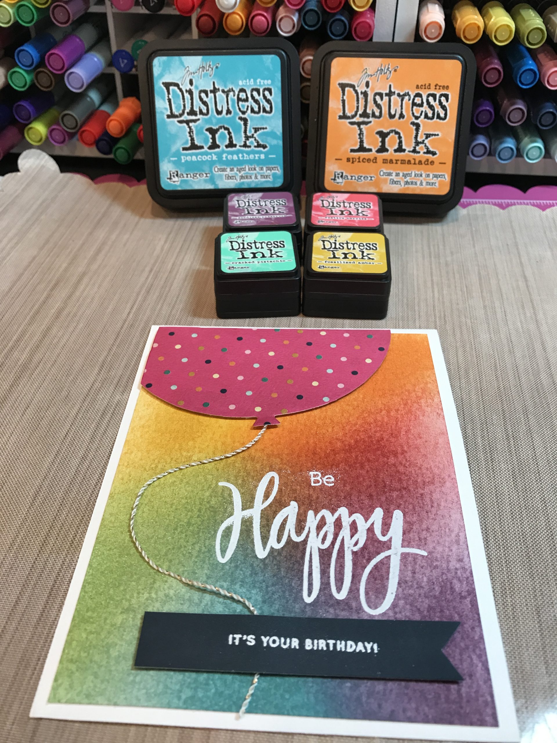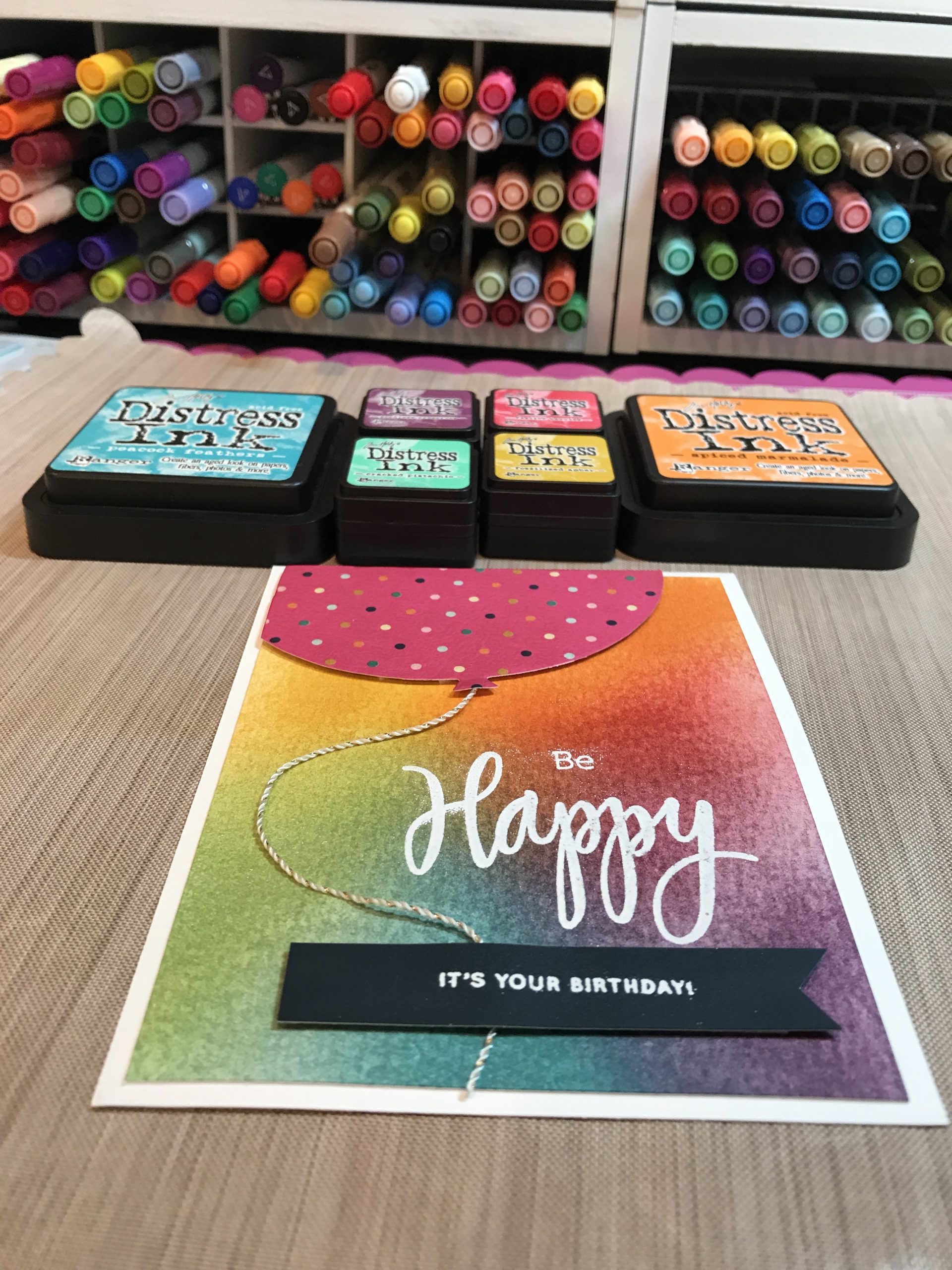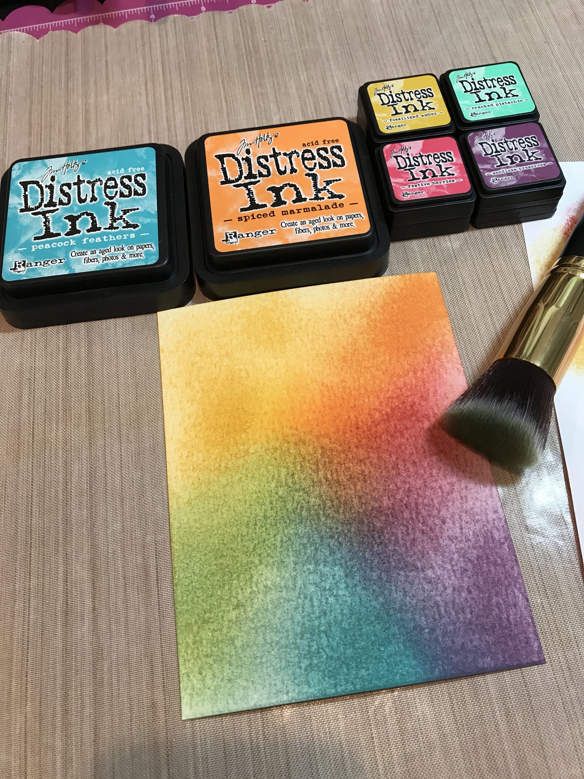 It’s the first day of Rainbow Maker class at OnlineCardClasses.com and I’m having so much fun with the ink blending techniques. I used distress inks and a makeup brush to create this rainbow background. Inks used were Peacock Feathers, Spiced Marmalade, Fossilized Amber, Festive Berries, Cracked Pistachio and Seedless Preserves.