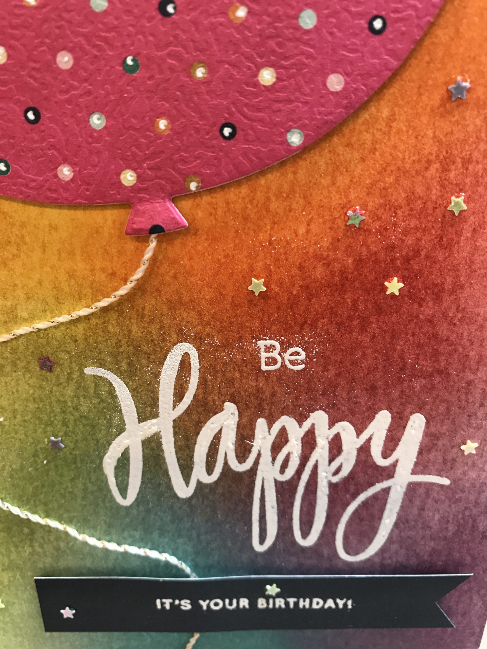 The “Be Happy” was stamped using versa mark ink and then embossed with white embossing powder. I created a banner to add to the bottom of the card by taking a strip of navy card stock and embossing the sentiment “It’s your birthday” with white embossing powder.