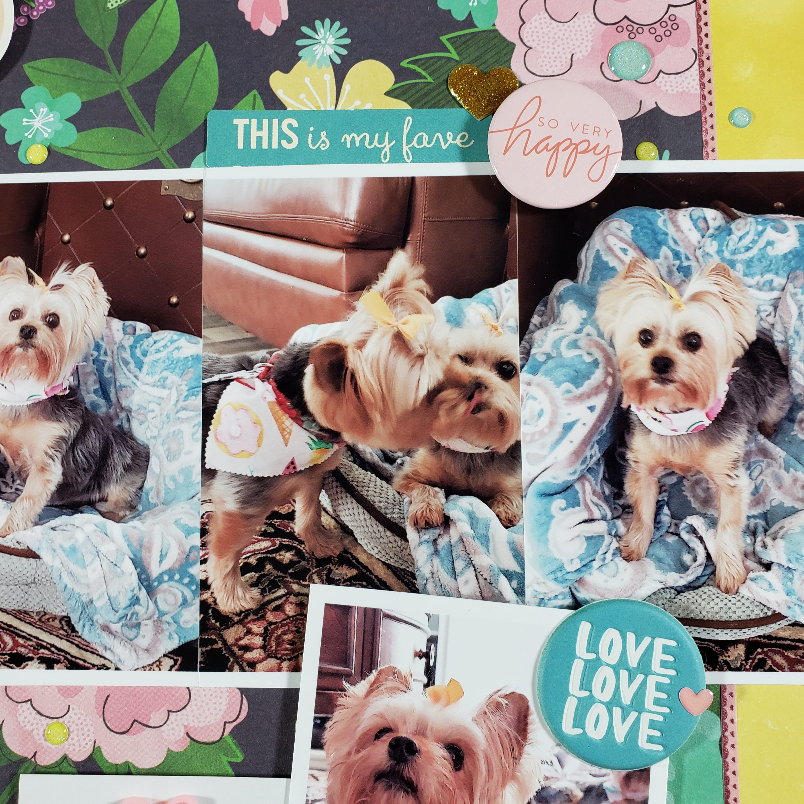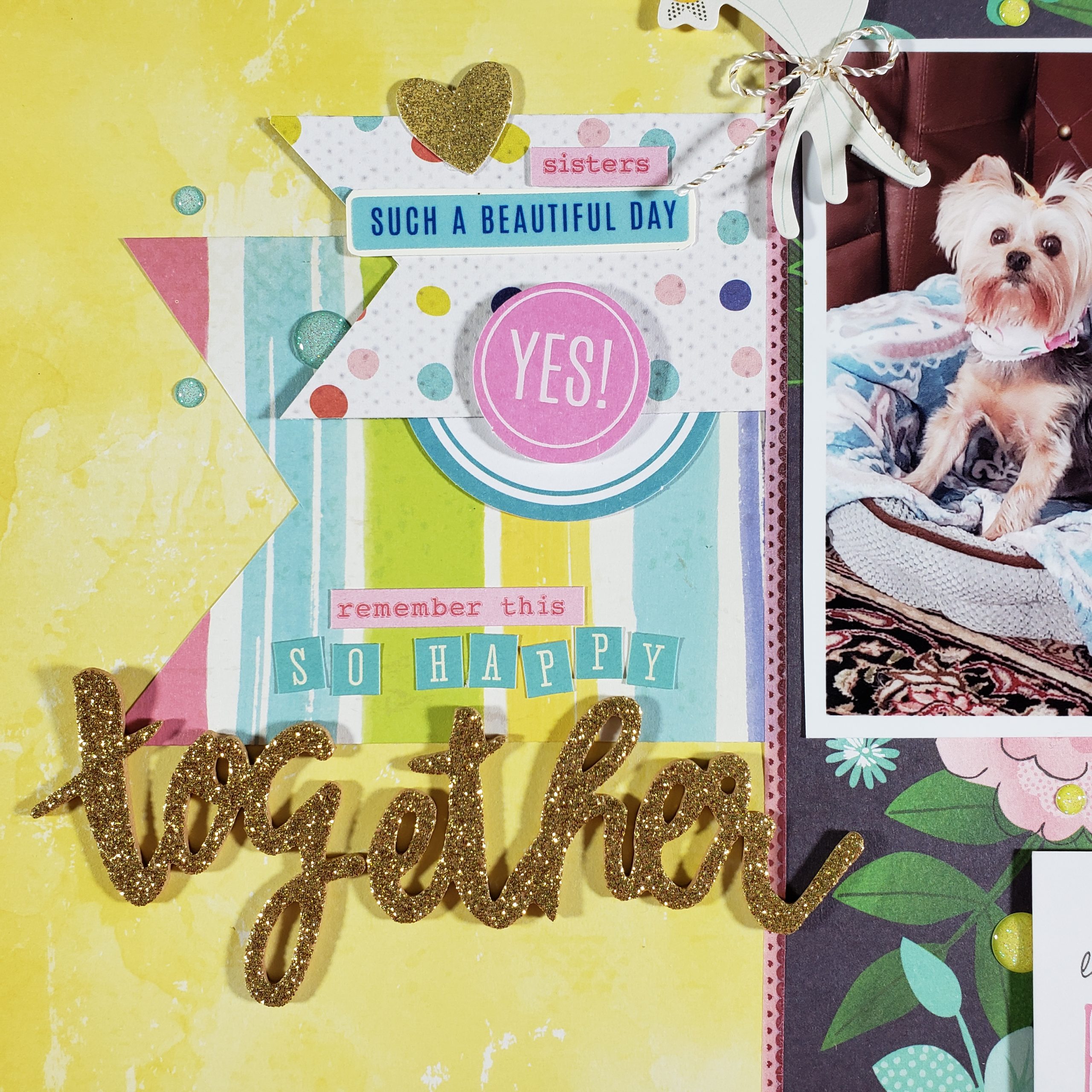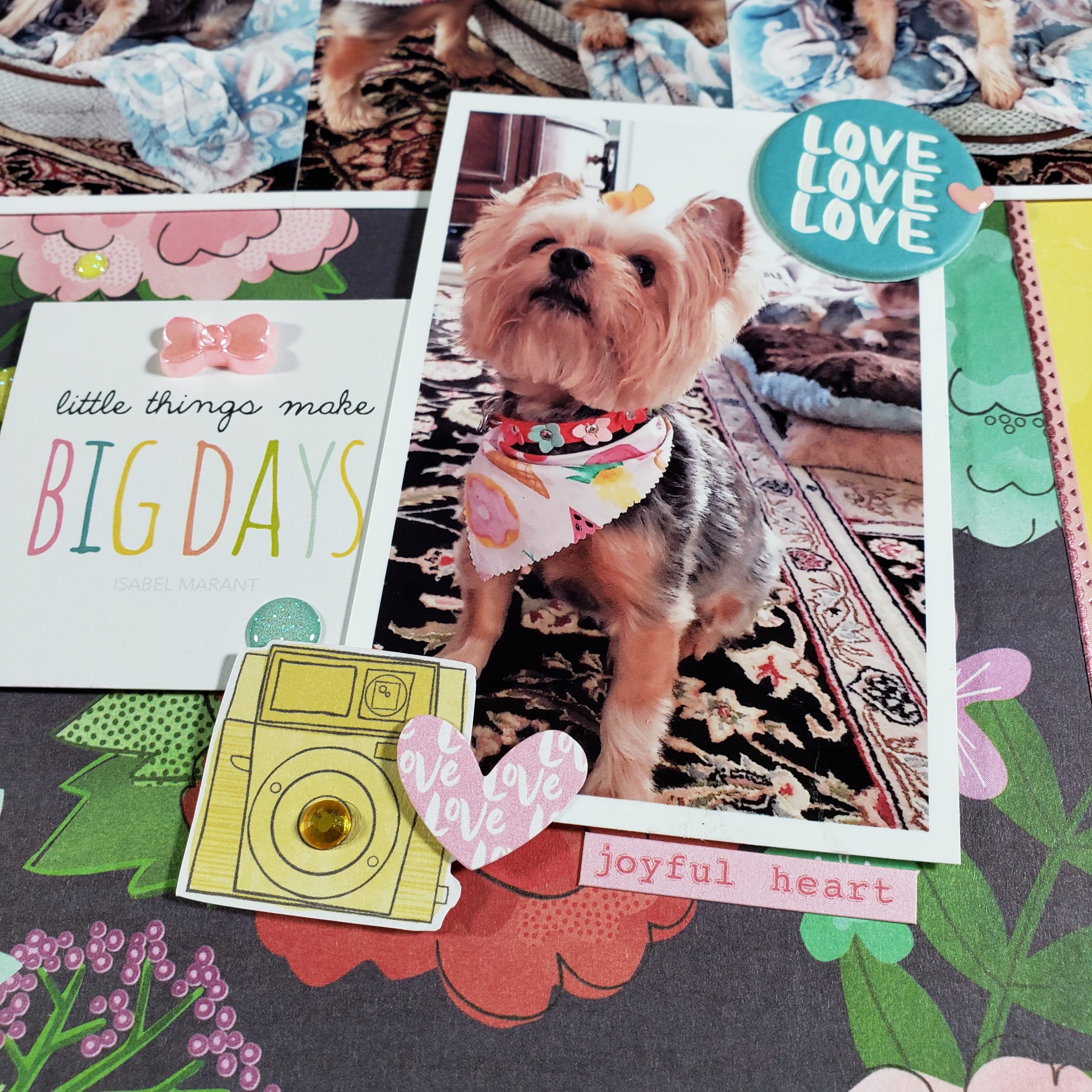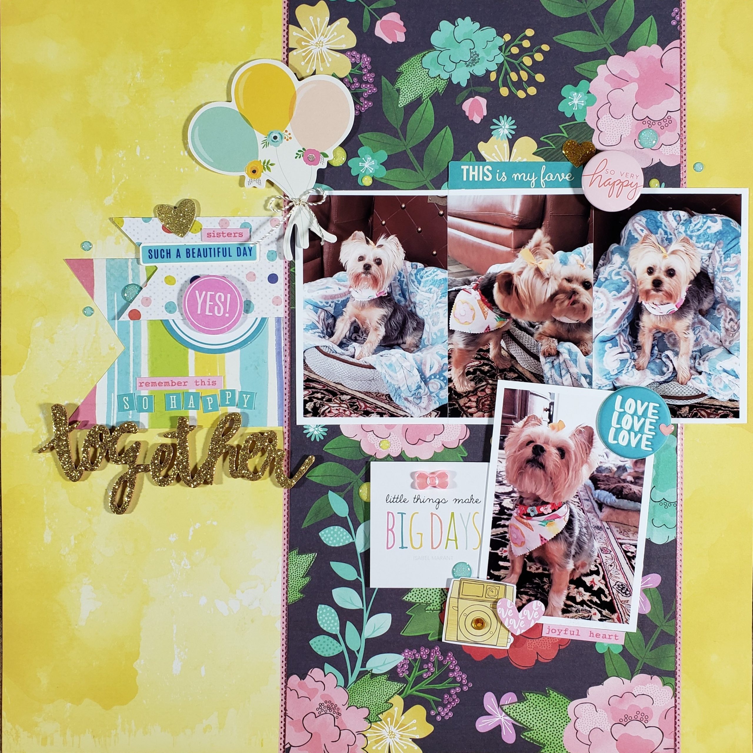I added a square diecut with the quote “Little Things Make Big Days” which I thought was so appropriate for this layout. My two dogs (Bella and LilyBelle) are sisters and when they were 4 years old, they started fighting with each other. We’ve worked very hard to have them get along together and it makes me so happy whenever I see them being sweet to each other.