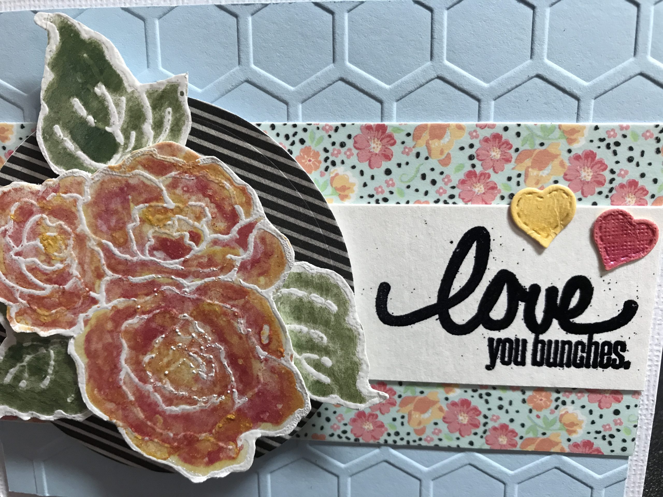 This card features a stamped image of flowers which was painted using custom inks created with Pearl Ex.